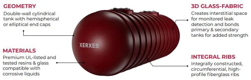 Even more importantly is the fact that a jacketed steel tank is not actually a true double-wall tank. Unlike with a jacketed tank, owners of a Xerxes fuel tank get the secondary containment wall required by the ANSI/CAN/UL/ULC1316:2018 standard for fiberglass – “a structure that is external to the primary tank designed to create an interstice and capture and contain leakage in case of failure of the primary tank.”